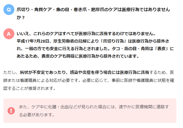 「よくあるお悩み相談Q&A」                爪切り・角質ケア・魚の目・巻き爪・肥厚爪のケアは医療行為ではありませんか?